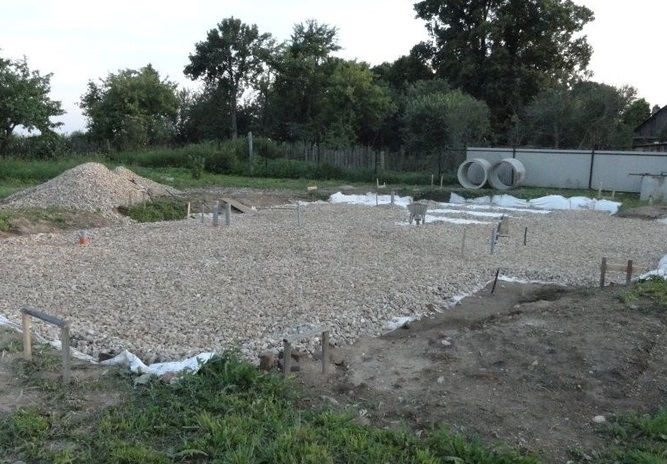 Наиболее ответственным этапом выступает расчет плитного фундамента. И только после этого осуществляется его закладка, которая сопровождается проведением земляных работ. Вырытый котлован трамбуется при помощи специальной машины и осуществляется формирование гравийно-песчаной подушки. Поверх подушки укладывается гидроизоляция в несколько слоев, заливается небольшой слой бетона.